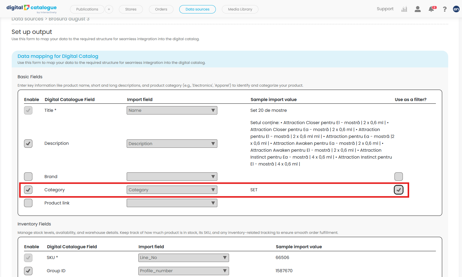 Enable filters: Make sure fields like Category, Brand, Size, and Colour (if applicable) are correctly mapped if you want them included in the Product Gallery filters. To do this, tick the Use as a filter checkbox on the right.