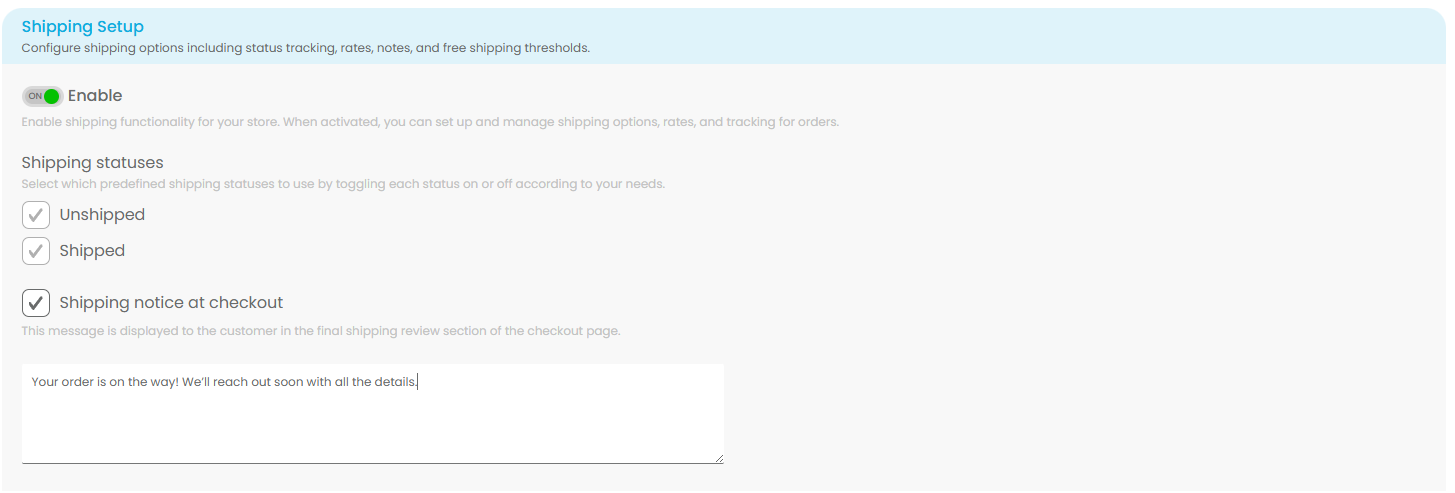 Activating the shipping feature allows you to manage shipping options and track orders seamlessly. Customize the process by selecting predefined shipping statuses and toggling them on or off based on your specific needs.