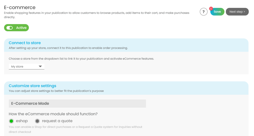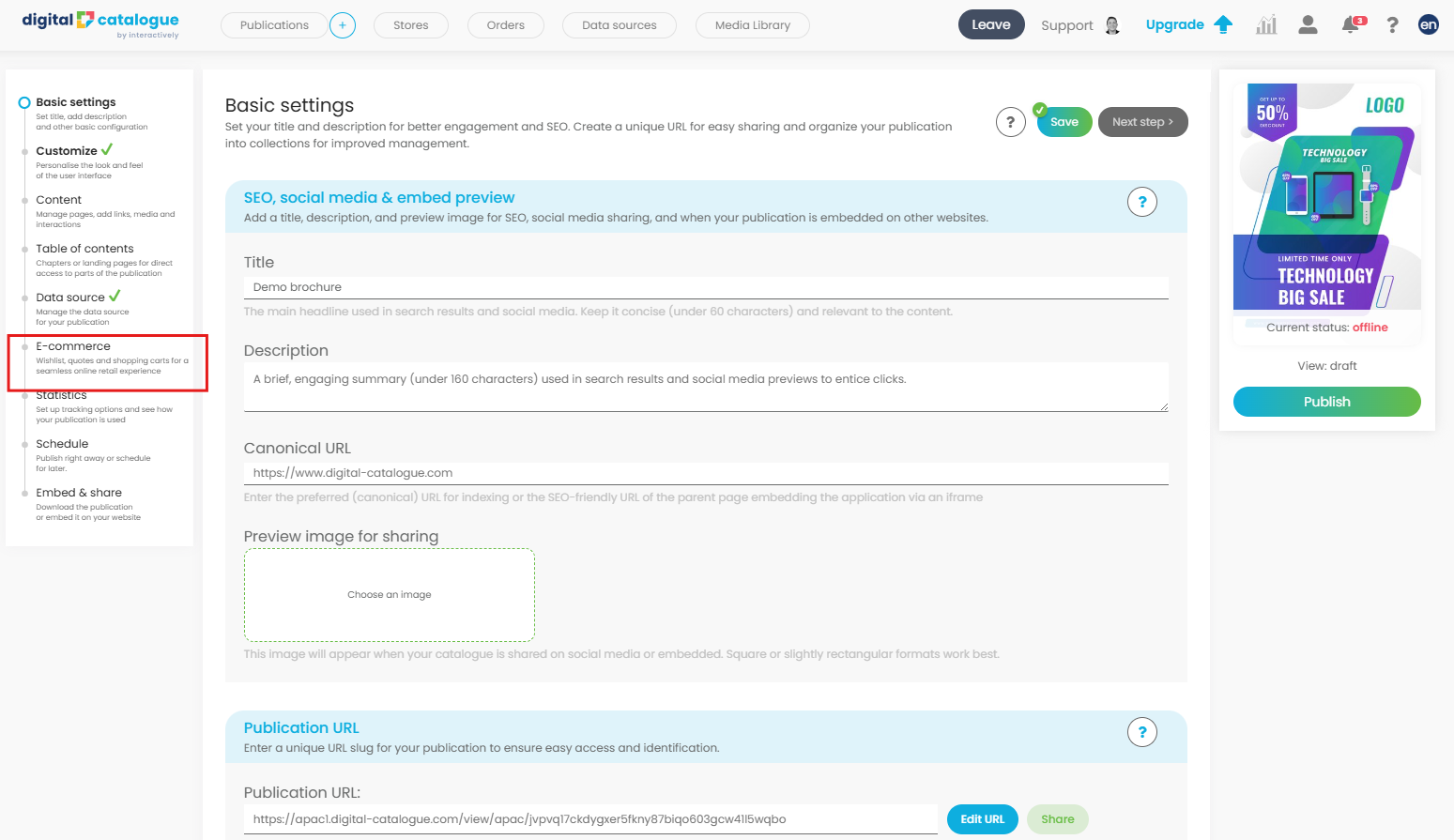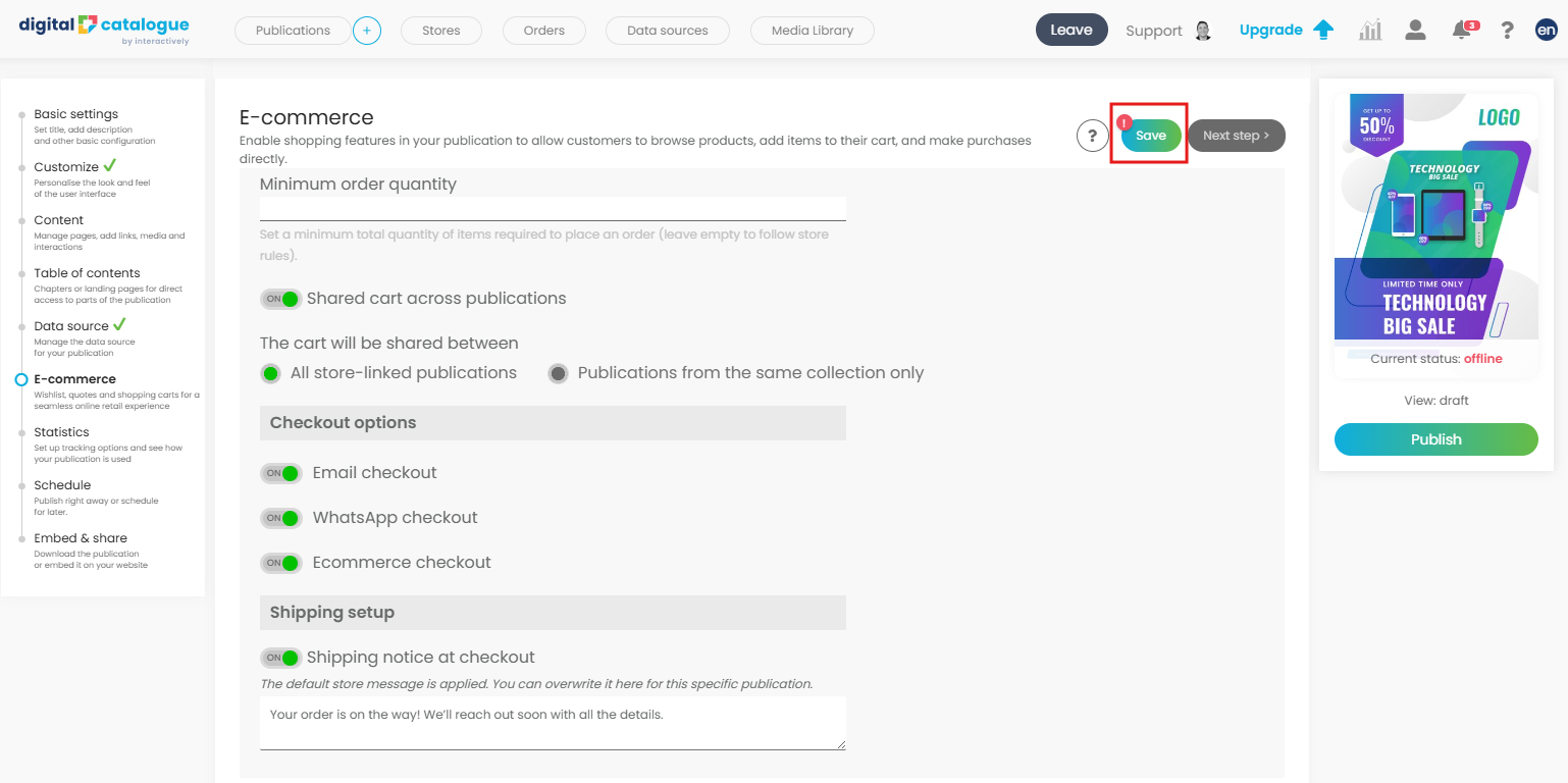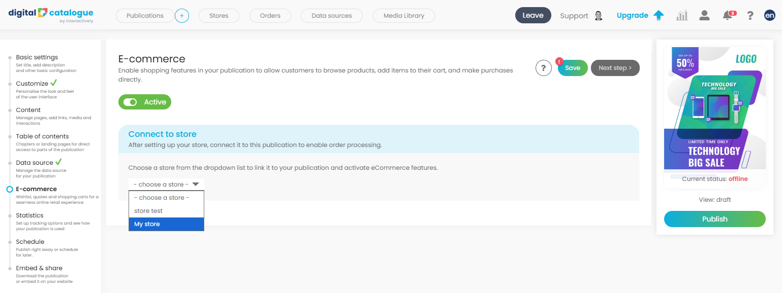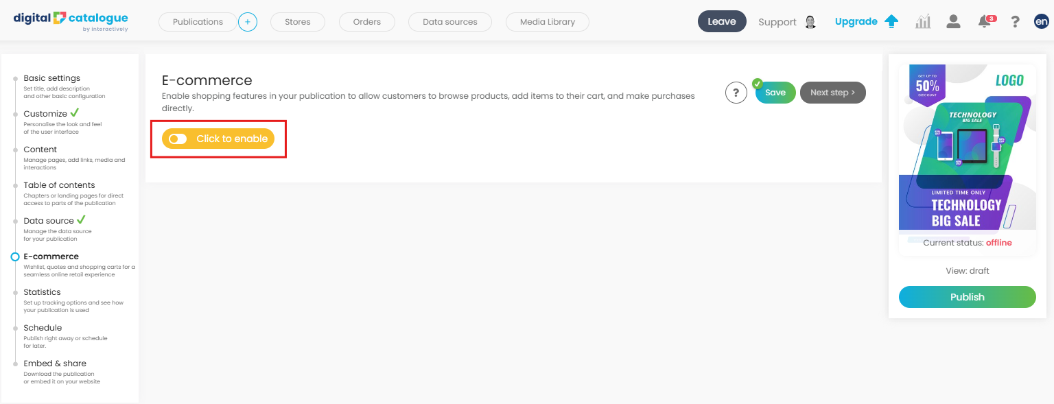 1) Choose your publication, then click on the E-commerce feature from the left-side panel.