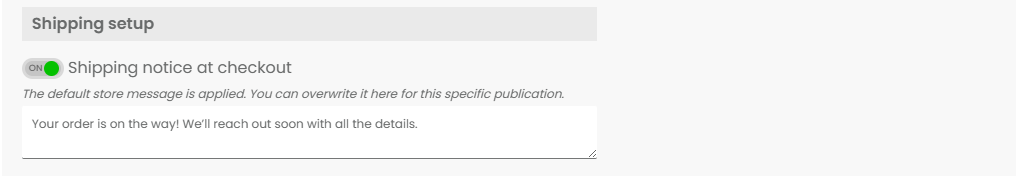 Shipping setup - The default store message for the Shipping notice at checkout is applied. You can overwrite it here for this specific publication.
